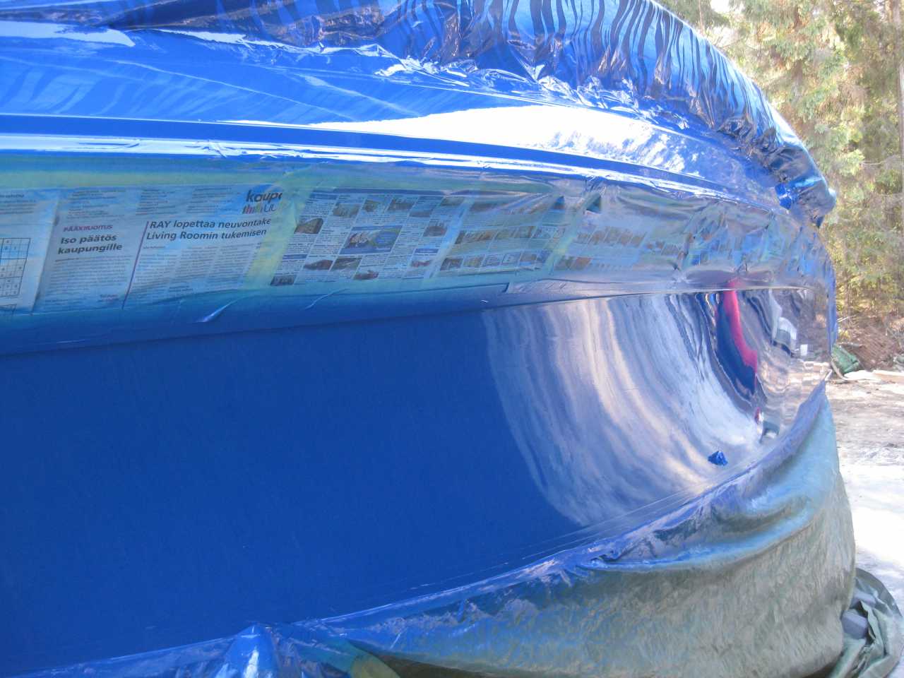 Joo, alkuperäinen maalipinta hiottiin pariin kertaan, mutta ei puhki vaan himmeäksi, kolot paikattiin ja hiottiin. Maali oli kaksikomponenttinen Hempel Poly Best, joka maalattiin kahteen kertaan. Maali levitettiin maalaussienellä ja tasoitettiin saman tien hyvällä pensselillä. Maali ei kuitenkaan suostunut täysin tasoittumaan eli ruiskulla olisi varmasti saanut paremman lopputuloksen, mutta silloin vene pitäisi käytännössä viedä maalaamoon.