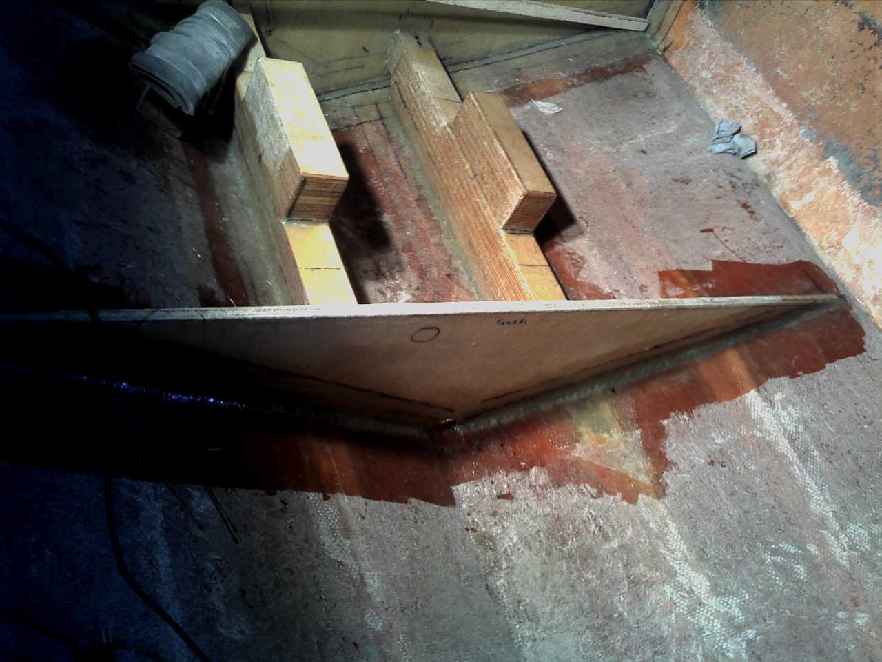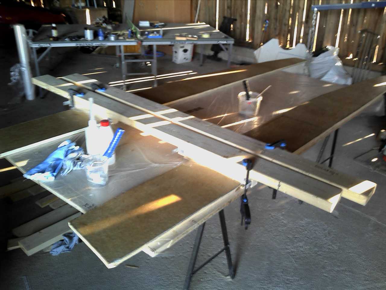 Stringereiden pituuden takia normi vanerin mitta 3m ei riitä vaan niitä joutuu jatkamaan....liitos tehtiin puolittamalla vaneria päädystä noin 25cm matkalta ja kuiduttamalla jatkos.