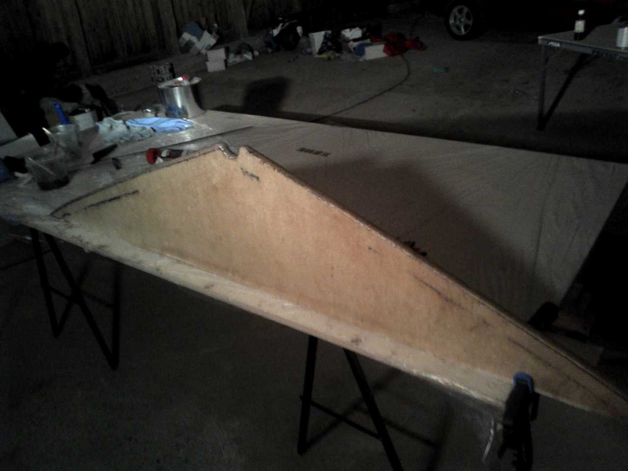ja aseteltiin sitten PB pedille...liittymiskohtiin muotoiltiin taas kovera muoto jotta kuidutus olisi helpompaa...kuivuttuaan tehtiin taas hionta ja tabbing kahdella kerroksella hakemattoa niin että päälle tuleva kerros menee 50mm yli edellisen.