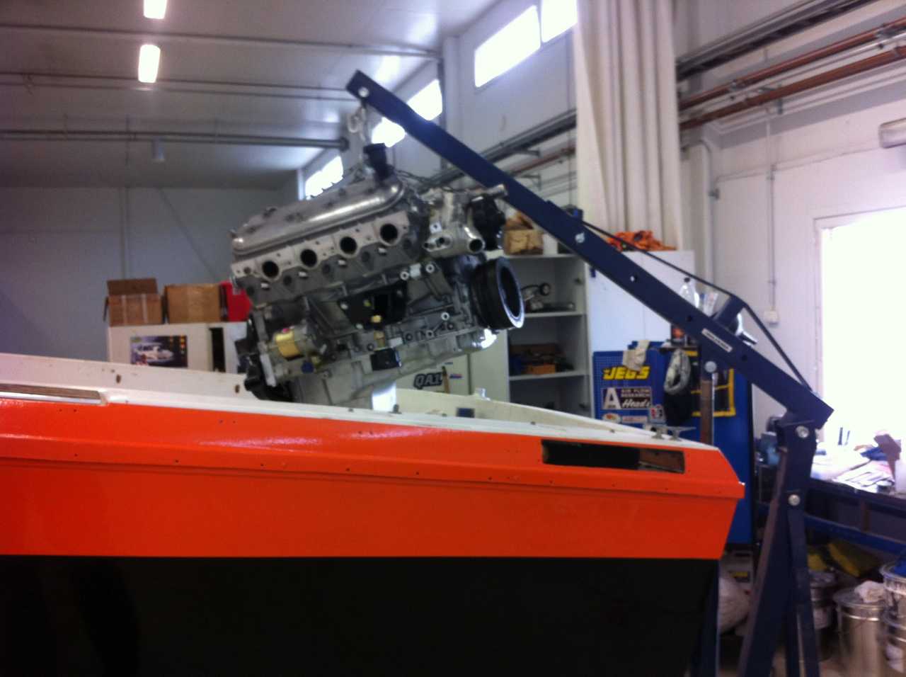 Moottorin kiinnittämiseen käytettiin lohkoon pultattavia siirtolevyjä joka mahdollistaa alkuperäisten moottorikiinnikkeiden käyttämisen.