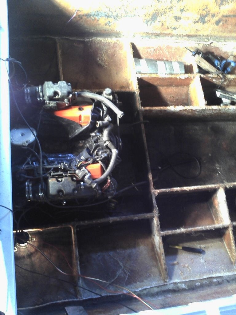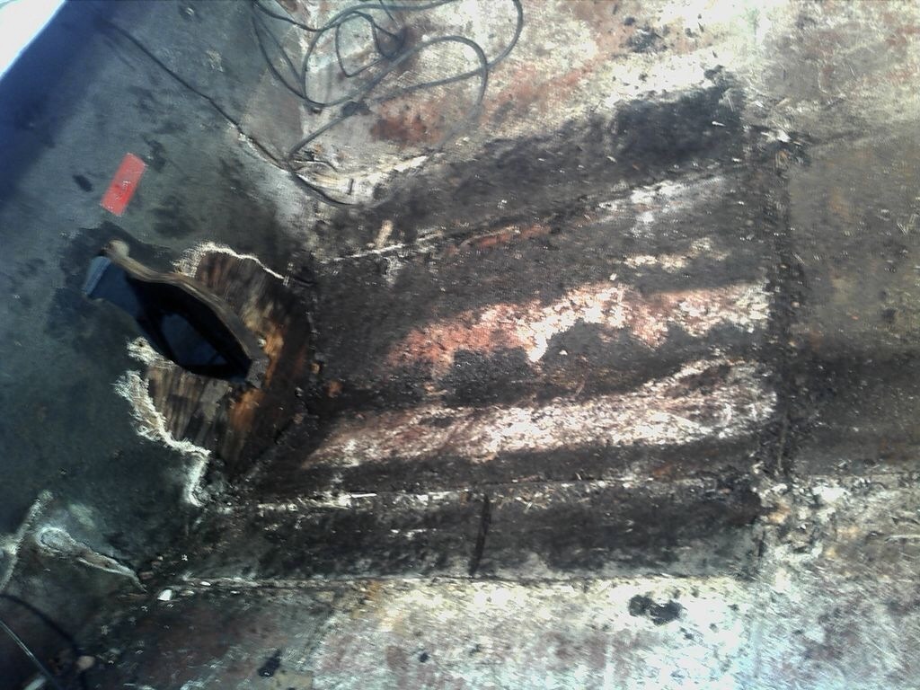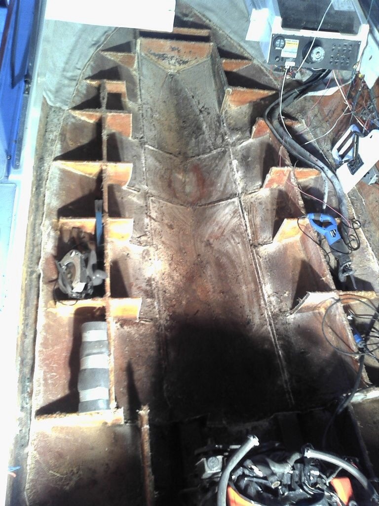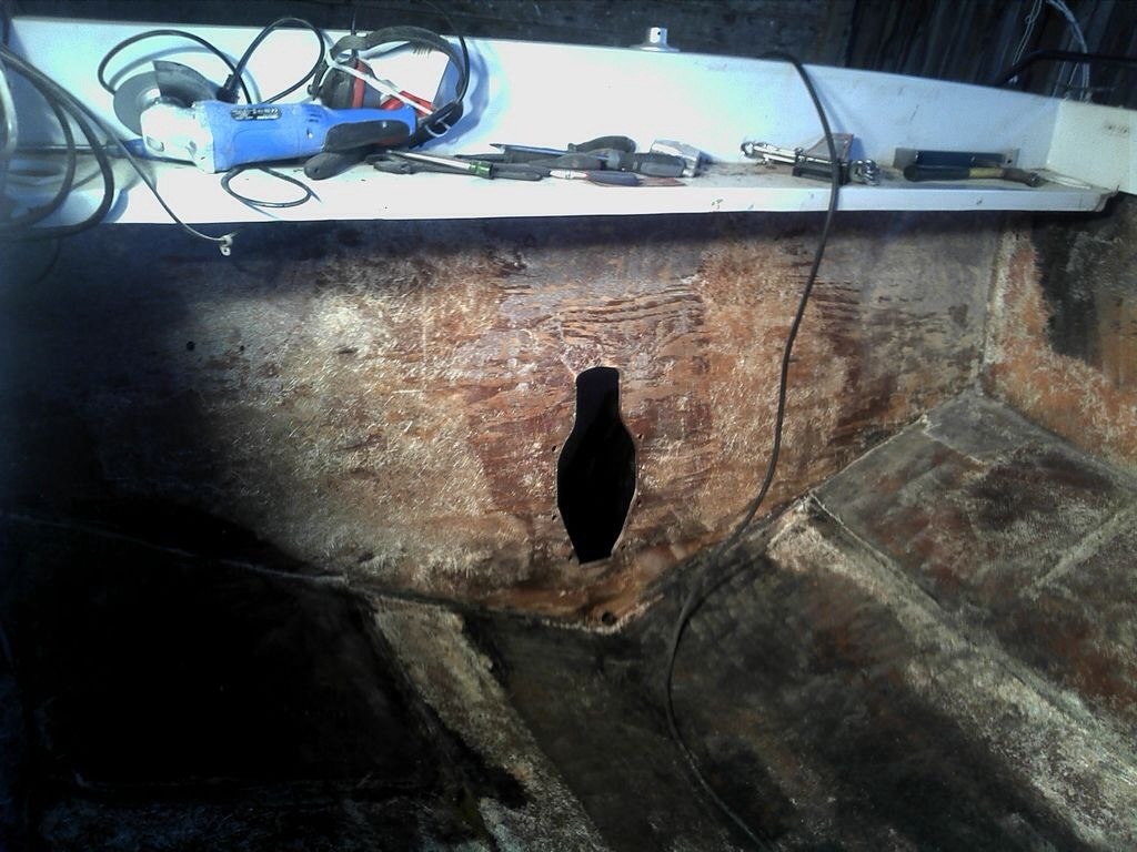 Elikkä tilanne oli seuraava.....poikittainen laipio tuon tankin edessä oli lahonnut (tod.näk jo vuosia sitten) ja lattia jousti hivenen siitä kohdin....mitään muuta ei oikein huomannut koska laipiota ei normaalisti näe ollenkaan....vain tuon tavarakotelon purkamalla pääsi laipiota koputtelemaan ja toteamaan että vain lasikuitupinta oli enää jäljellä.
