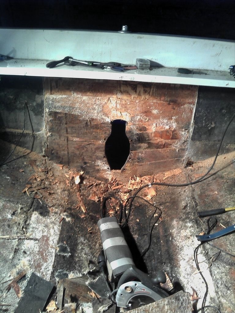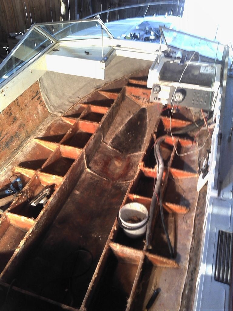 Pahimmin olivat kärsineet juuri nuo poikittaiset vanerit eli laipiot. Myös tuo moottoritilan etuseinä oli osittain haperoa ja se leikattiin pois.