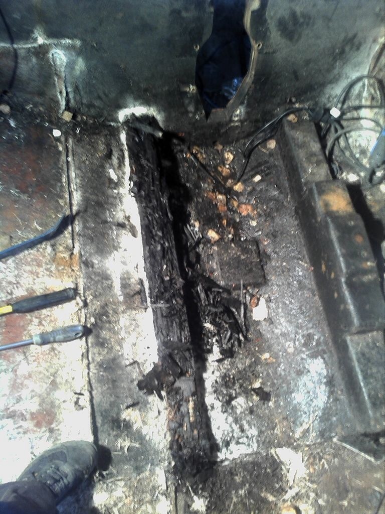 Tässä vaiheessa hytin sisustus oli purettu pois ja lattia oli jo sirkkelillä leikattu palasiksi ja sorkkaraudalla kammettu irti.