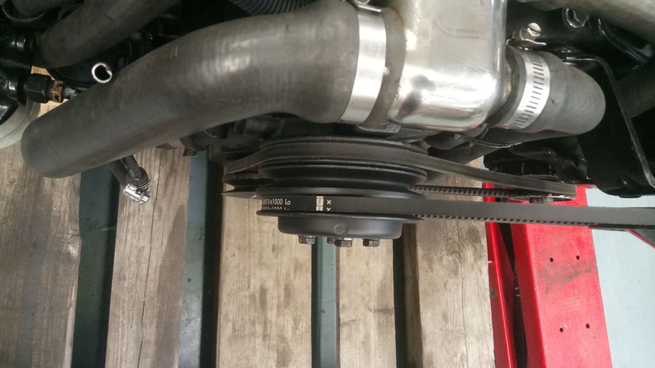 Vesipumpun pyörä saattaa tosiaan mennä kummalla hihnalla tahansa mutta kampiakselilla oleva pyörä ei hyväksy kapeampaa hihnaa. Jos laturille löytyisi leveämmälle hihnalle pyörä niin epäkohta saattaisi hyvinkin korjaantua.